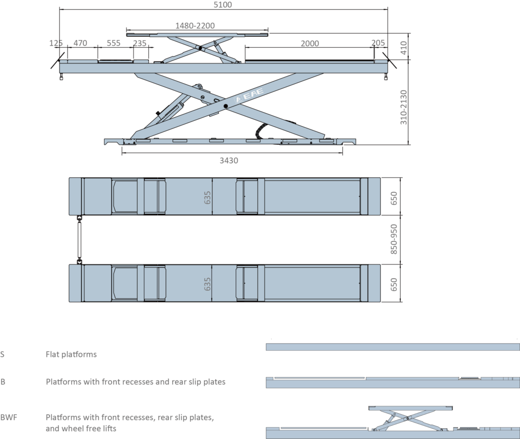 Saxlyften har en inbyggd saxlyft i körbanorna och är förberedd för hjulinställning med inbyggda glidplattor i bak och har uttag för vridplattor i fram. (vridplattor är tillägg)